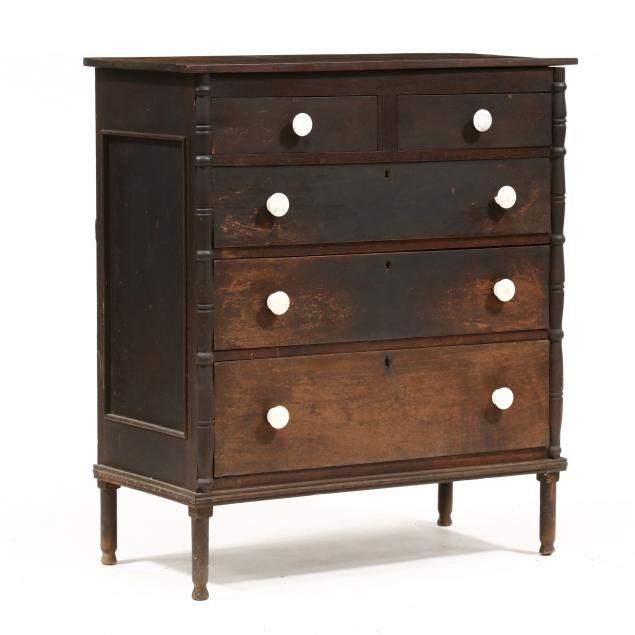 Attributed to the Brower School, Randolph County, circa 1830-40, poplar secondary, two over three graduated flush drawers, applied half column at stiles, paneled sides, applied molding at base, turned legs.
