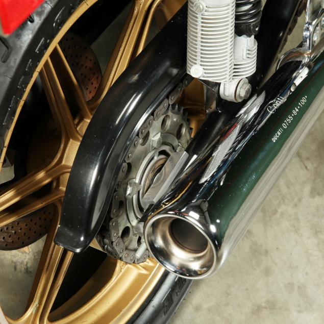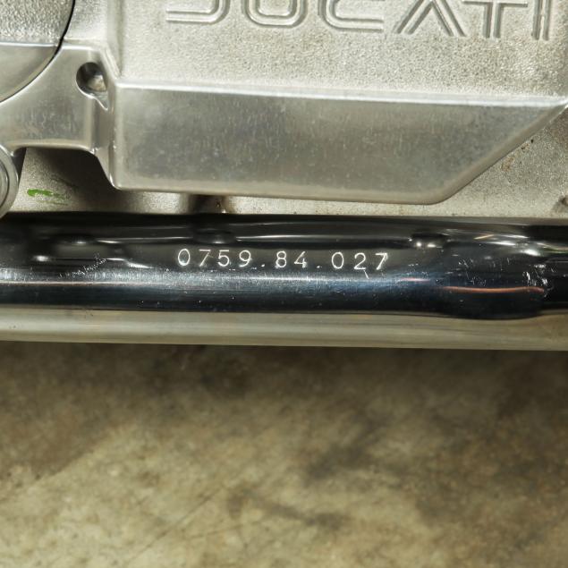 With a 864 cc air cooled 90 degree V-Twin four stroke engine with bevel gear drive, producing 68 horsepower and a five speed transmission. Twin 40 mm carburetors with cone type air filters. With Brembo brakes front and rear, and Marzocchi adjustable rear shocks. It features electric start, and Nippon Denso instruments and switches for reliability. A Conti dual exhaust is installed, with the original two into one single exhaust is included along with the center stand that was removed from the bike.