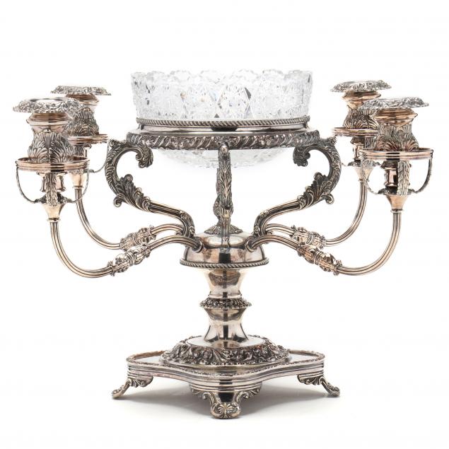 Late 19th or early 20th century, with engraved Prince of Wales feathers mark to underside, allover scrolled foliate and acanthus decoration, the standard supporting a cut crystal bowl over four convertible form candle arms, over a baluster form shaft, raised on a square pedestal base.