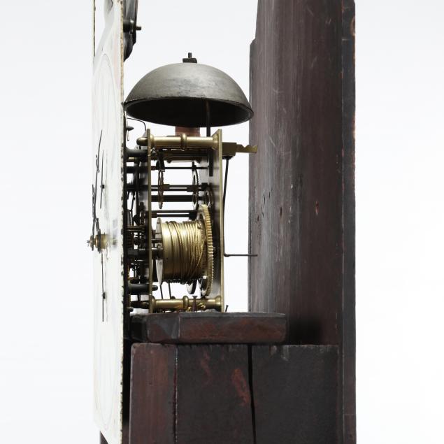 From the Collection of Ed Neal, Oxford, North Carolina Some minor veneer patches; retains old wavy glass; touch-ups to painted face with old crazing; waist door with later hinges; feet are old and appear original, the front left foot tipped 1/2 inch; professionally restored by Daniel Buffinga, Oxford, North Carolina.