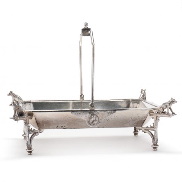 With fully molded fox decoration at each corner, horse head medallions to each side, engraved foliate decoration to well, applied swing handle, raised on (4) gothic style feet, central monogram to well.