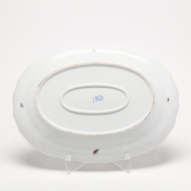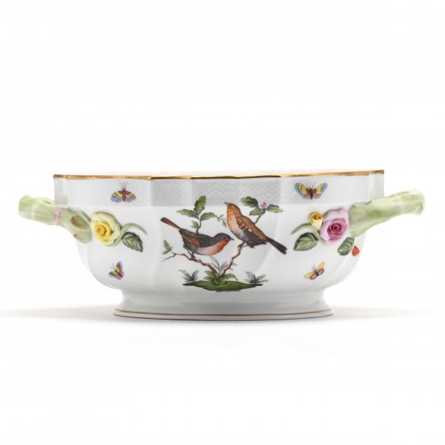 Hand painted with traditional bird and insect pattern, with gold rim; oval tureen with green branch handles and floral applied decoration, lid with bird finial above oak leaves and acorns #1014 (DOA 9 x 12 1/2 x 8 in.); oval serving platter #1102 (11 x 14 3/4 in.); both marked "HEREND / HUNGARY / HANDPAINTED" to underside.