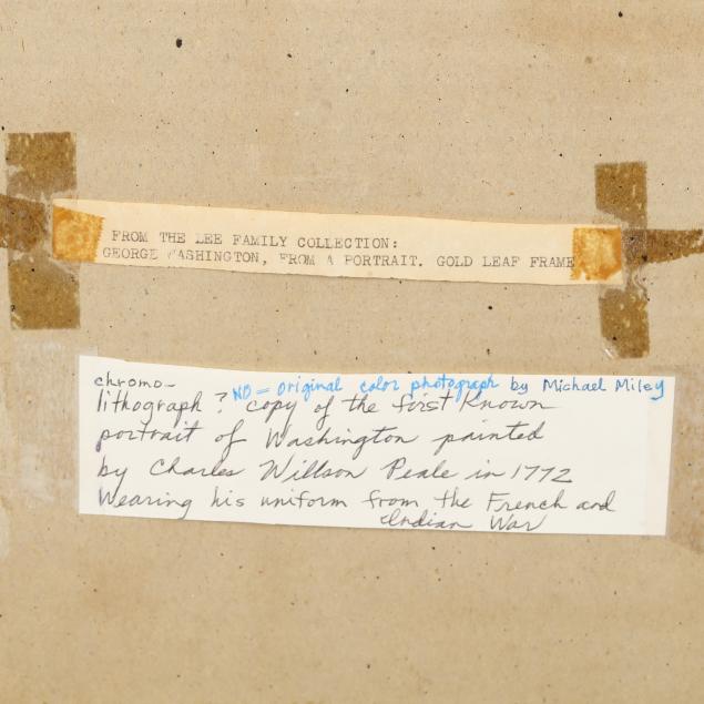 An early color image reproducing George Washington's 1772 oil portrait that hangs in the Lee Chapel at Washington & Lee University, Lexington, Virginia. Miley's print is behind glass in its original gilt wooden frame, the back of which carries an early typed label reading: "From the Lee Family Collection: George Washington, From a Portrait. Gold Leaf Frame." Below this is a somewhat later note taped to the backing that reads,"chromolithograph? No - original color photograph by Michael Miley / copy of the first known portrait of Washington painted by Charles Wilson Peale in 1772 wearing his uniform from the French and Indian War." This historic photograph is among the first successful color prints produced in the United States. Michael Miley (1841-1918) of Lexington, Virginia, launched his career with post-war portraits of General Robert E. Lee, becoming a highly successful and innovative photographer in his later years. A Miley exhibition article in the April, 1980 Washington & Lee University Alumni Magazine states that, "In the first years of the 20th century, Miley perfected a process of printing color photographs by superimposing separate single-color carbon images in each of the primary colors. He and his son, Henry, patented the technique in 1902 and in 1905 were awarded a Medal of Merit by the Franklin Institute." Miley's experiments with color photography favored still life arrangements and inanimate objects such as the Washington painting. Although black and white prints by Miley occasionally appear in the market, his color images seem to be largely institutional and thus unavailable to collectors. Print 9-1/4 x 7 in.; Frame 16-3/4 x 13-3/4 in.