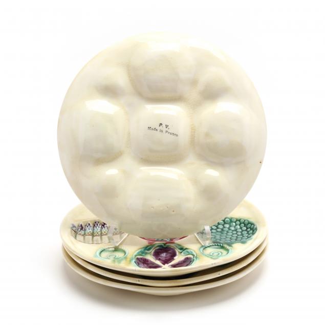 Made in France, mid-20th century, each of the five wells is painted with a type of vegetable, the undersides are stamped "P.V. made in France".