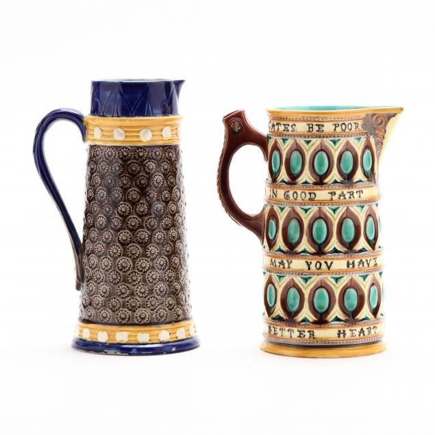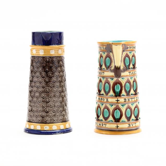 England, a motto tankard circa 1860s, and a chocolate pot, circa 1880s, both stamped Wedgwood (although faintly) on the undersides.