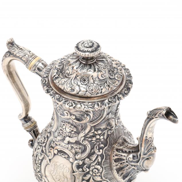 Edinburgh (1822), baluster form profusely decorated with floral, foliate, and rocaille motifs, shield form cartouches to recto and verso above which stands a proud lion, one cartouche with script monogram "LGG."
