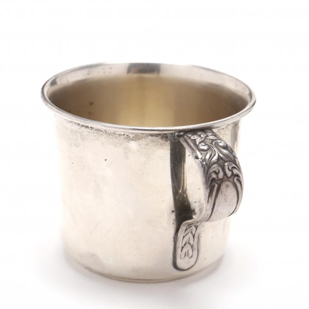 The first, a Mexican silver baby cup, with mark of José Marmolejo, foliate handle, without a monogram (1 3/4 in.); and a baby rattle, mark of Dominick & Haff, pattern number 5, with dangling charms and whistle top, without a monogram (3 3/4 in.).