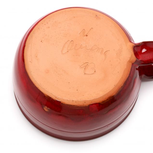 20th century, red glazed earthenware, six (6) dinner plates signed M.L. Owens, (10 1/2 in.) (all plates with small scratches), the (6) cereal bowls were made by Boyd Owens and are so signed (2 1/4 x 1/8 in.), (6) salad plates signed M.L. Owens, (8 in.) (several very small scratch marks), (6) saucers and (5) cups signed N. Owens, (6) coasters signed N. Owens, (6) soup mugs signed N. Owens, a sugar and cream jug, illegible mark, and a coffee mug signed N. Owens.