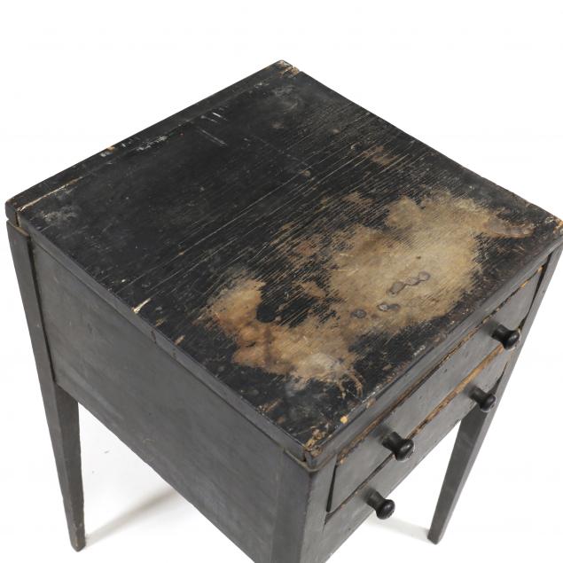 Western region, circa 1820-40, white pine and poplar with all over old (likely original) black paint, two graduated drawers (the lower with divided interior), square tapered legs.