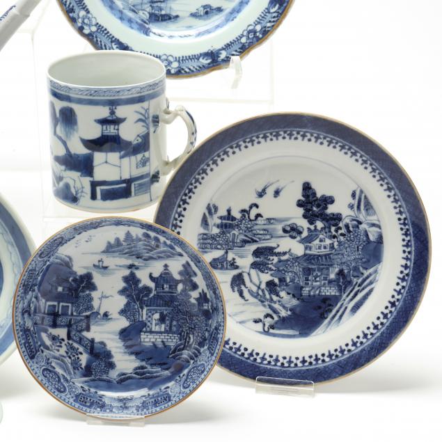 19th and 20th centuty, (21) pieces hand painted in underglaze blue with Canton pattern of a riverscape populated with Chinese-style buildings and mountains including: one plate (9 in.), three plates (7 1/2 in.), two soup bowls (8 1/2 and 9 in. dia.), one dessert bowl (5 1/2 in.), a lidded tureen (5 1/2 x 6 in. dia.), a leaf dish, a lidded teapot (5 1/2 x 9 in.), a covered vegetable bowl (8 x 6 1/4 in.), a cream jug, two mugs, a sauce boat, an underplate (marked with Chinese seal), a lidded and double handled tea cup, and four demitasse cups; (3) pieces of hand-painted underglaze blue and white porcelain including a small footed bowl with dragon decoration, a soup bowl (8 3/4 in.) and a sparrow beak jug with still life decoration; and an English blue and white porcelain platter in the Chinese taste, transferred decoration, mark of Thomas Goode & Co., London (13 x 17 in.).