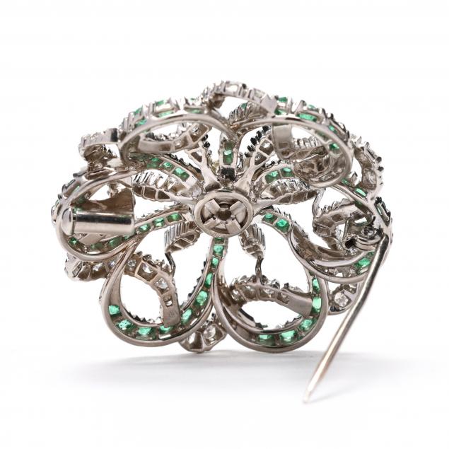 Centered on a round brilliant cut diamond weighing approximately .70 carat (M color, VS1 clarity), the surround with intertwined motif set with round cut emeralds weighing approximately 1.5 total carats and with single cut diamonds weighing approximately 1.0 total carat (H-I color, VS2-SI1 clarity), completed with single locking pin stem stamped 750.