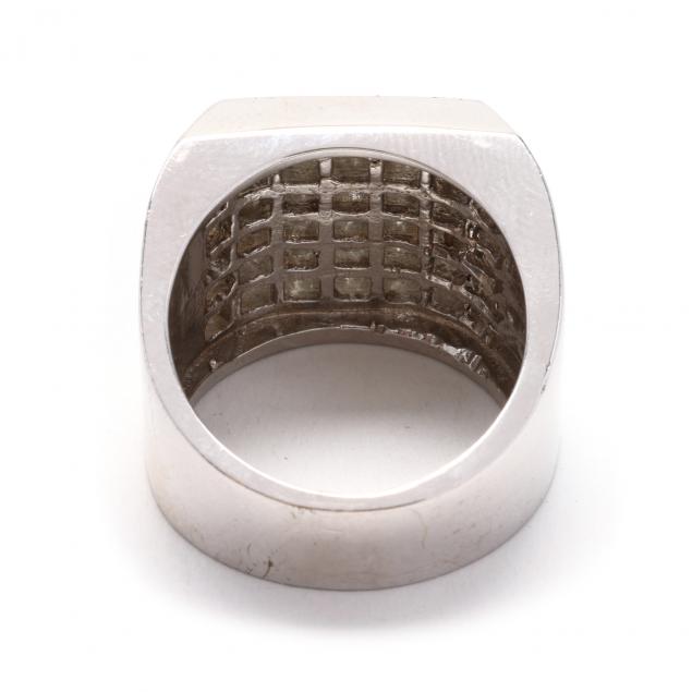 Square design ring invisibly set with princess cut diamonds weighing approximately 7.3 total carats (G-H color, SI2-I1 clarity), stamped 18K.
