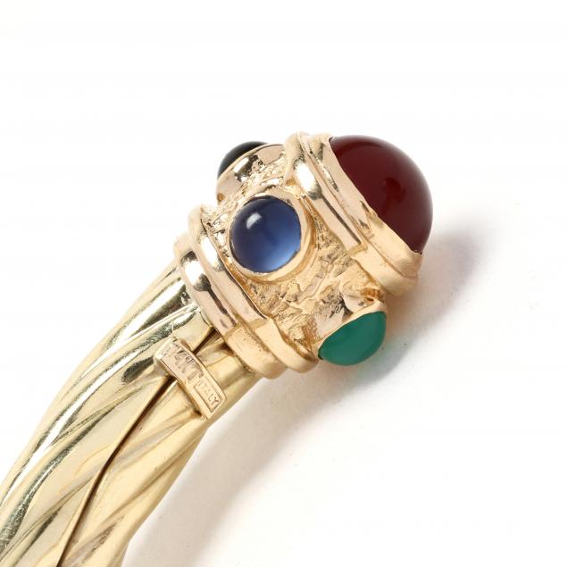 Twist design cuff with round cabochon carnelian terminals and set with round cabochon multicolor chalcedony, stamped 14KT Italy and with partial mark GOI.