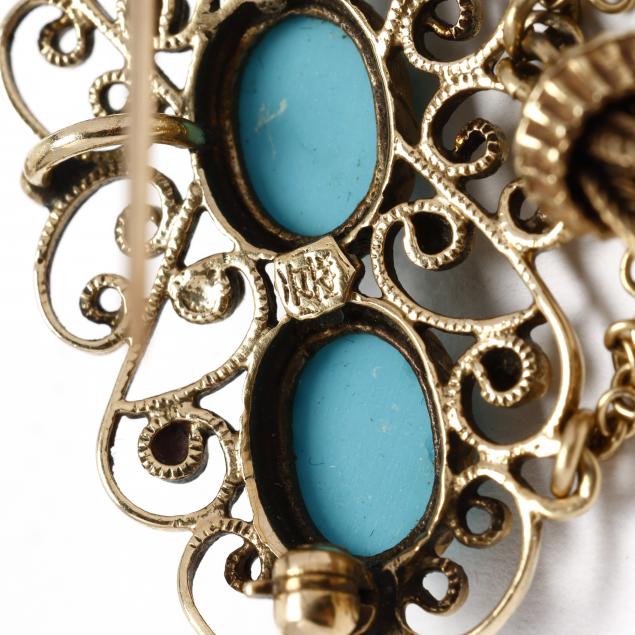 To include: a filigree pendant / brooch with crown and heart motif set with a round cabochon turquoise (4.5mm) and round cultured pearls (3mm), completed with a single locking pin stem and bail, testing 14KT (1.75 in.); a vintage circle pendant / brooch set with a circle of round cabochon turquoise (3.0 - 3.5 mm) and a round cultured pearl (4.5mm), with cannetille details, completed with a hinged bail and locking pin stem, stamped 14K and with maker's mark (1 7/8 in.); and a filigree bar brooch with three oval cabochon turquoise (8 x 6 mm) and with tassel drop, completed with a bail and with a single locking pin stem, testing 14KT (1.75 x 1.5 in.).