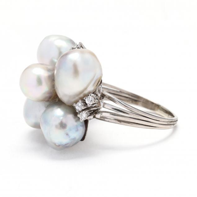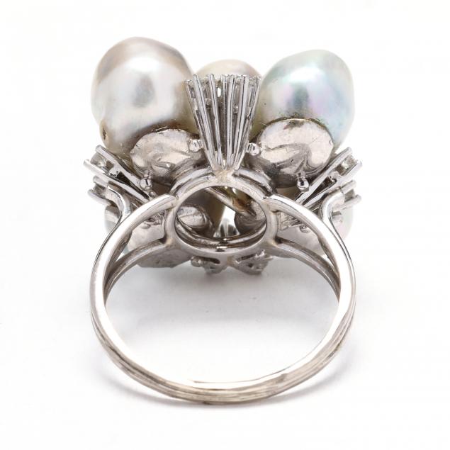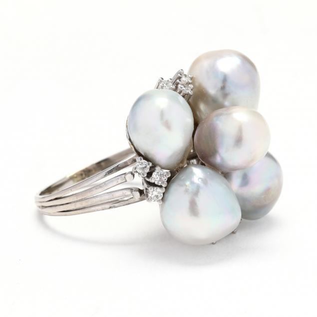 Set to the center with a cluster of gray semi-baroque pearls and with full cut round diamond melee, with split shank and testing 14KT.