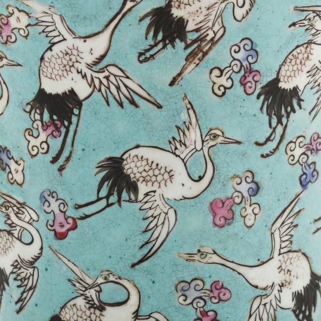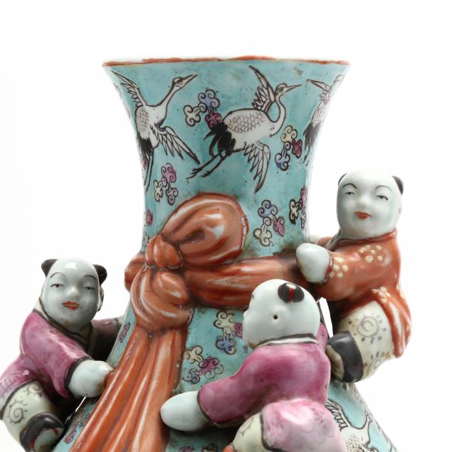 Includes a mid to late 20th century tall vase with turquoise blue ground populated by cranes and clouds, in high relief attached to vase are small Chinese boys climbing up the side, marked to underside, and a smaller 19th century vase hand painted in underglaze blue with Chinese men engaged in daily leisure and work activities against a large crackle glaze ground, dark brown glazed impressed decorative bands at top of body and above the foot, impressed mark to underside.