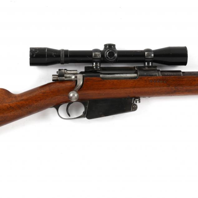 Serial number W3484 on barrel, receiver, bottom of magazine and stock, 24.75 in. barrel, receiver marked MAUSER MODELO ARGENTINO 1891 / DEUTSCHE WAFFEN-UND MUNITIONSFABRIKEN / BERLIN, DACOTE 4x32 crosshair reticle scope, walnut stock with original buttplate, five round magazine.