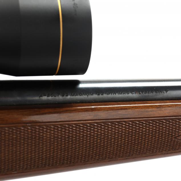 Serial number 03476NY136 on receiver, 22 in. blued barrel marked BROWNING ARMS COMPANY / MORGAN UTAH & MONTREAL P.Q. / MADE IN JAPAN / A-BOLT 22 MAGNUM 22 WIN MAG CALIBER ONLY with fixed front sight, dove tail rear sight and LEUPOLD VX-1 3-9X 40MM duplex reticle scope, walnut stock with checkered grip and forend with original BROWNING buttplate.