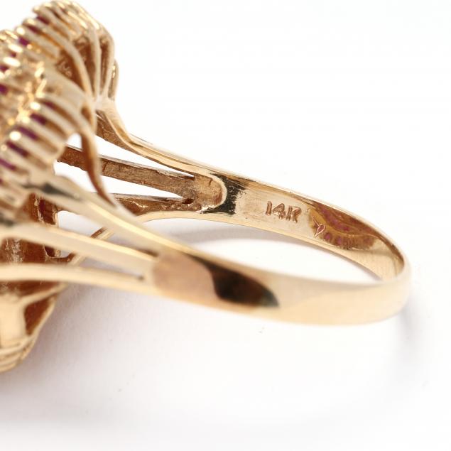 To include: a vintage ring set with a row of round cut rubies and with rose cut diamonds, stamped 22 ct (ring size 6.75); one designed in yellow gold and set with marquise cut rubies and with single cut diamond melee set in white gold, stamped 10K (ring size 5.75); a band set with oval cut rubies alternating with single cut diamond melee, stamped 14K (3.3mm; ring size 4.5); one in a swirl motif centering on an oval cut ruby (7 x 5 mm) and the swirls set with tapered baguette cut rubies, stamped 14K (20.0 x 18.7 mm; ring size 6.75); and one centering on an oval cut ruby (6.75 x 6.0 mm) and with pear cut ruby accents and single cut diamond melee, testing 10KT (17.6mm; ring size 5).
