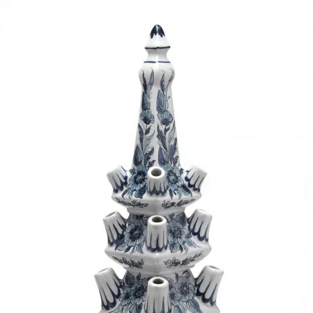Made in Italy, blue and white pottery reproductions of the late 17th century originals from the collection at Chatsworth Castle, England. Tulipieres, or tulip pagodas, were an ornamental type of vase devised by the Dutch to display their prized tulips or other flowers. Marked on the undersides.