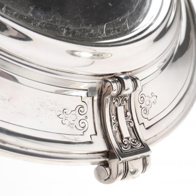 Retailed by Bailey Banks & Biddle, Philadelphia, Pennsylvania, the bowl pattern number 38252, with stylized foliate motifs raised on a reticulated pedestal foot with four ball feet, topped with a gilt brass reticulated flower frog lid, the stand pattern number 38251, with conforming decoration and scrolled feet; each with the script monogram "HJK", engraved date of "1915-1940" to undersides.