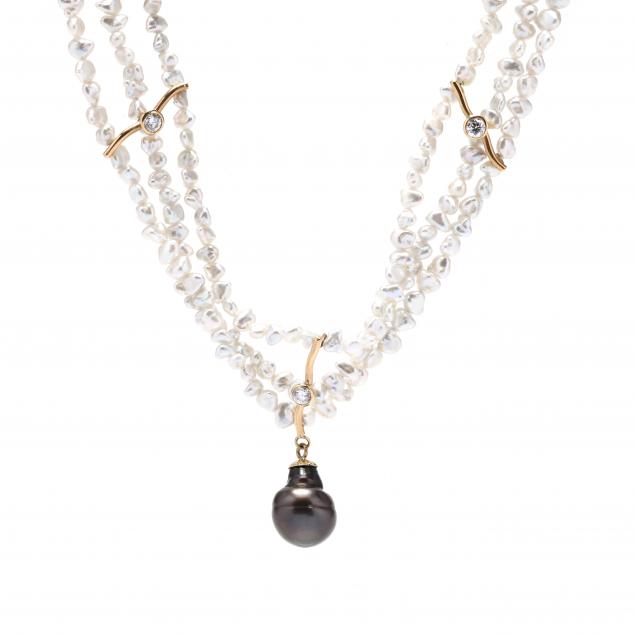To include a four strand bracelet strung with white cultured pearls (3mm) and completed with a white gold bar clasp set with square cut diamond accents, testing 14KT (7.25 in.); a three strand bracelet strung with white cultured pearls (4.5mm average) and completed with a gold filigree clasp stamped 14K (7 in.); and a three strand freshwater pearl necklace with gold bar spacers with diamond melee accents and suspending a gray drop pearl, stamped 14K (15 in.) (clasp with looseness).