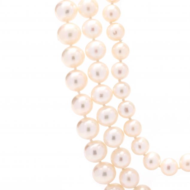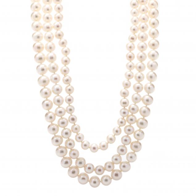 Necklace strung knotted with three strands of near round to oval pearls, outer strand strung with (55) pearls (9.5mm average), the middle strand strung with (56) pearls (8.5mm) and the inner strand with (58) (7mm); completed with a gold barrel clasp stamped 585.