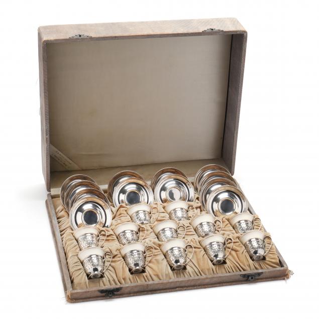 Includes (12) demitasse cups, pattern code A5549, each a reticulated form with a porcelain insert by Lenox, and (12) saucers, pattern code A5550; all without monograms; presented with an original fitted fabric lined case.