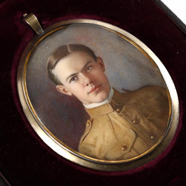 J D Rice / 1905 to right edge, presented in a silver locket (unmarked, acid tested silver), within a bifold presentation case fitted with aubergine velvet and silk interior.