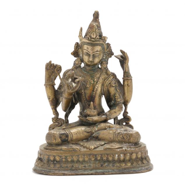 19th or 20th century, Tibetan or Nepalese, a nicely cast sculpture of a seated bodhisattva holding prayers beads in one raised hand and a jar with the elixir of life in her lap, wearing elaborate jewelry, earrings, and a tiered crown, Chenrezig, also known as Avalokiteshvara, is the bodhisattva of compassion and is highly revered in Buddhism, has a dotted inscription to reverse side of lotus blossom base.
