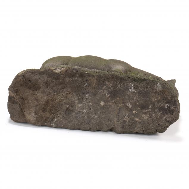 Circa 1920s, carved dark porous stone, stylized stallion with almond eyes, streamlined muzzle and brow, short mane and long tail, grazing atop an integral domed terrace, unsigned.