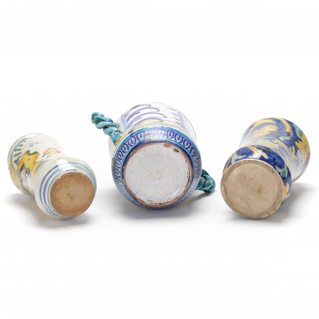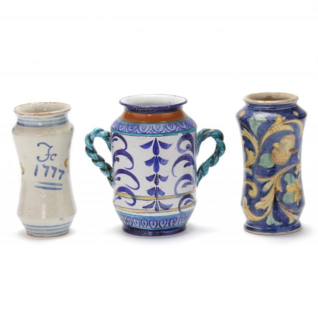 18th century, two Albarello form, four color decoration, one dated "1777", the third jar features rope twist handles, labeled "Borrana" which may refer to a medicinal root or leaf as designated by the panels flanking the profile of a man, all otherwise unmarked.