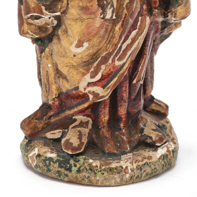 18th century or earlier, carved wood with plaster coating decorated with gilt and polychrome painted features; the Madonna is portrayed standing on a naturalistic base and holding the Christ child, unmarked.