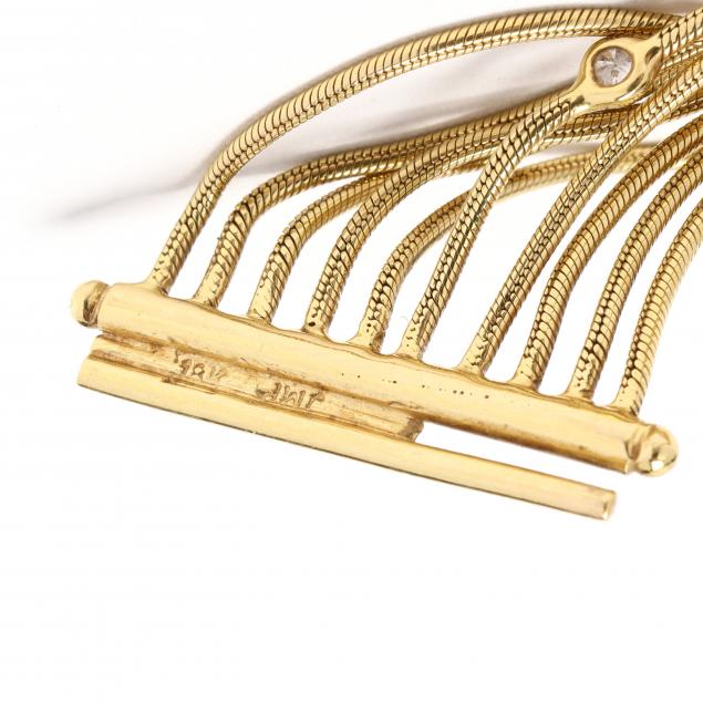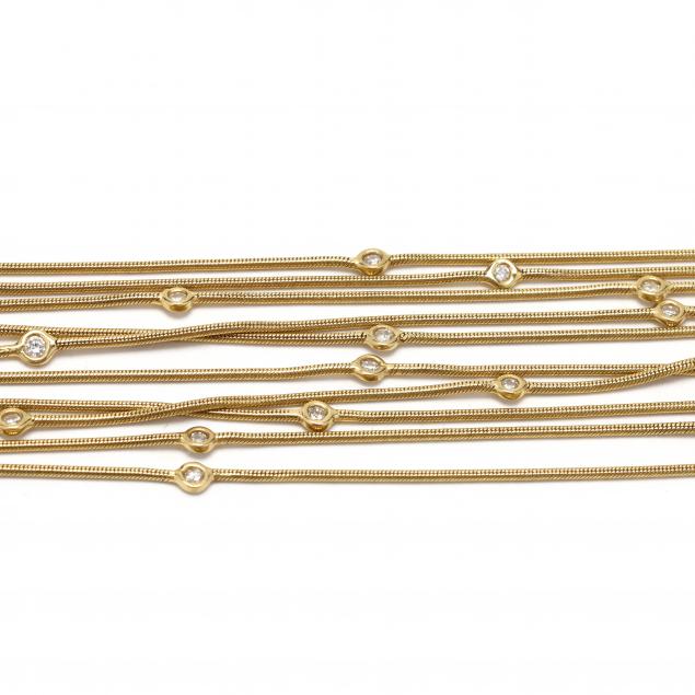 With ten snake chain strands each with three bezel set full cut round diamonds weighing approximately .53 total carat (H-I color, SI2-I1 clarity), completed with a slide clasp with two figure eight safety catches, stamped 18K and JMP.