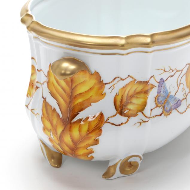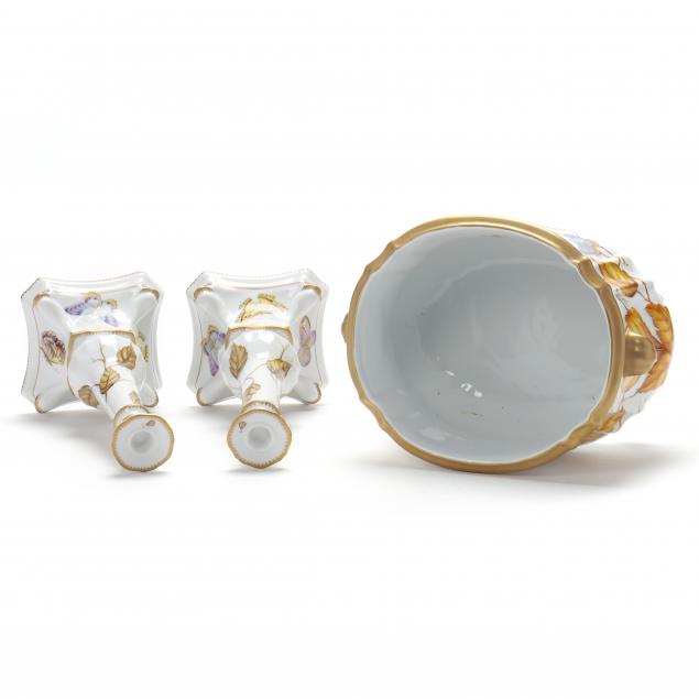 (5) pieces, Hungary, 21st century, all having a shaped gilt rim above a hand-painted design of leaves, butterflies and insects, to include: a pair of candlesticks (10 1/4 in.), an open tureen signed on the underside "Anna Weatherly 2005" (7 10 in.), a coupe serving dish (13 1/4 in.) and a platter (13 1/2 in.) all with backstamps.