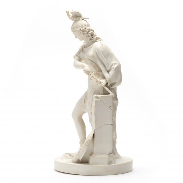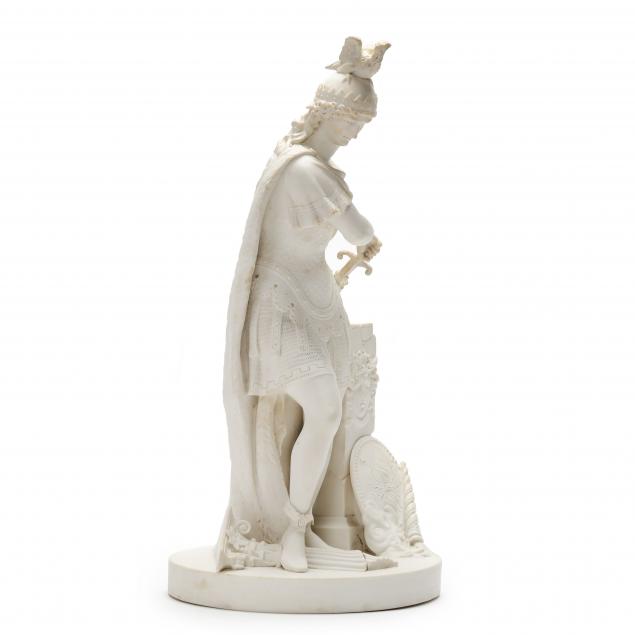 Second half 19th century, an imposing English Parian unglazed porcelain standing Perseus in full armor, perhaps about to rescue Andromeda from the sea monster, strongly attributed to Minton and modeled by Victor Simyan who was a French sculptor who settled in England in circa 1860. Not signed.