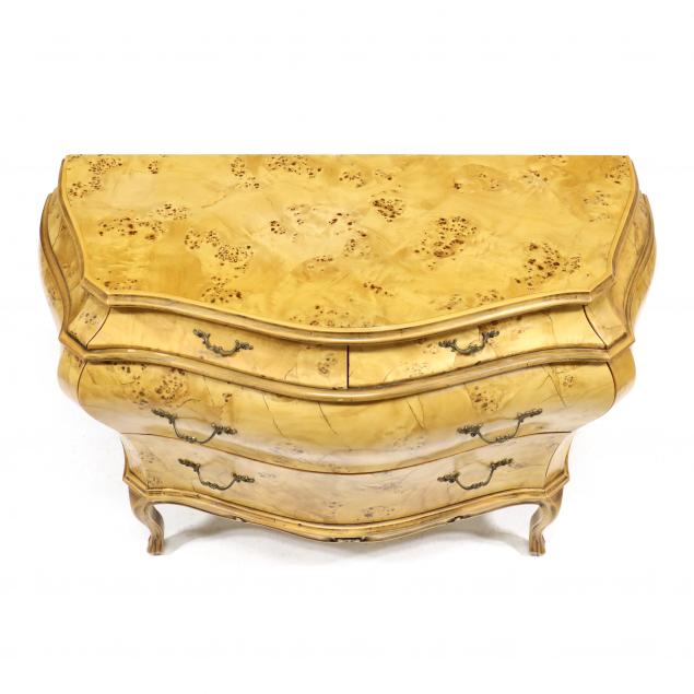 Late 20th century, burl maple veneer, shaped top, two over two drawer configuration on cabriole legs, marked Made in Italy to back.