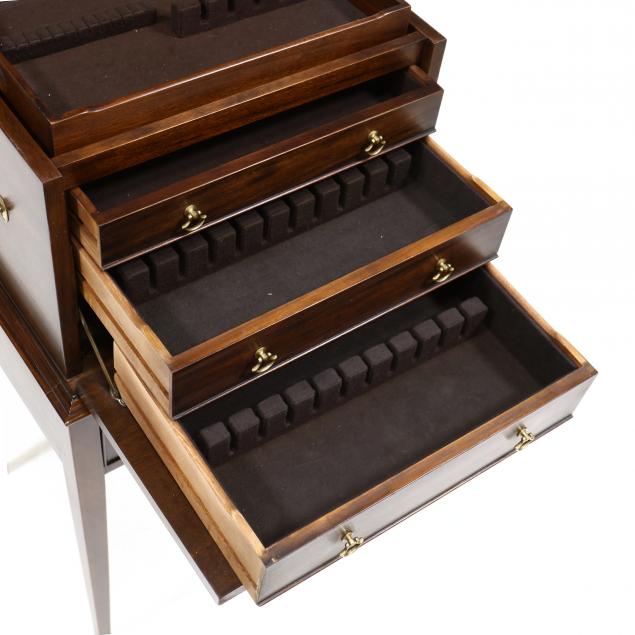 Late 20th century, finish no. 29, one part form, hinged lid, fall front panel with light wood line inlay and figured wood panel, interior with removable tray and three graduated drawers, the base with a single drawer raised on tall square tapered legs, case sides with bail handles, labeled.