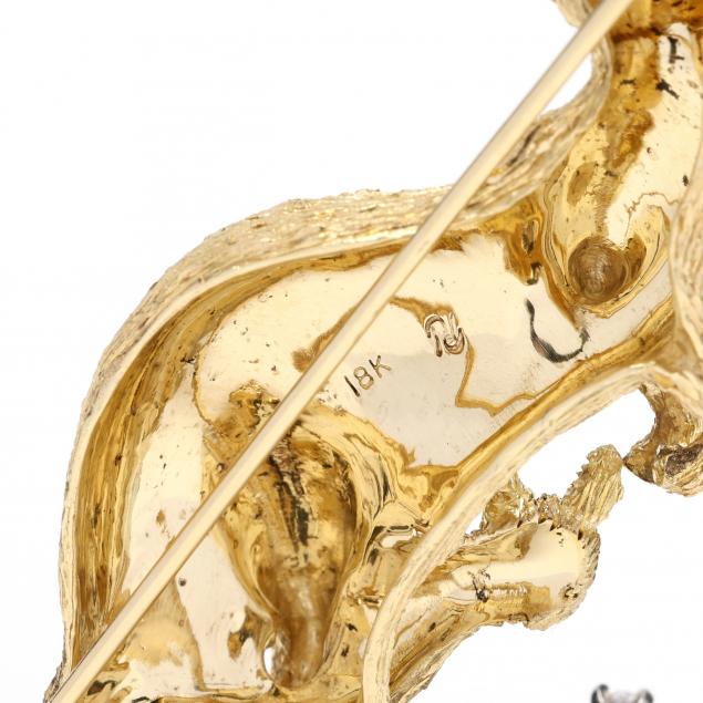 The textured gold brooch designed as a kangaroo with joey in pouch, each with round cut ruby eyes, kangaroo set with a full cut round diamond (2.5mm) at foot, completed with a single locking pin stem, stamped 18K and with maker's mark.
