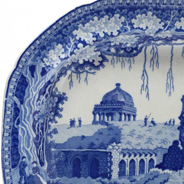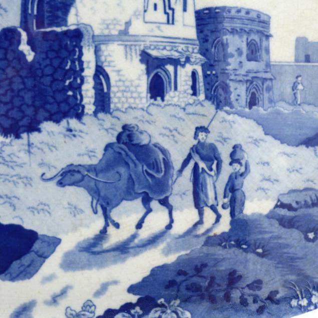 England, first half19th century, the first is a John Rogers and Son blue and white transfer printed platter, with decoration from the Indian Views series, printed with figures leading a laden ox before ruins, titled