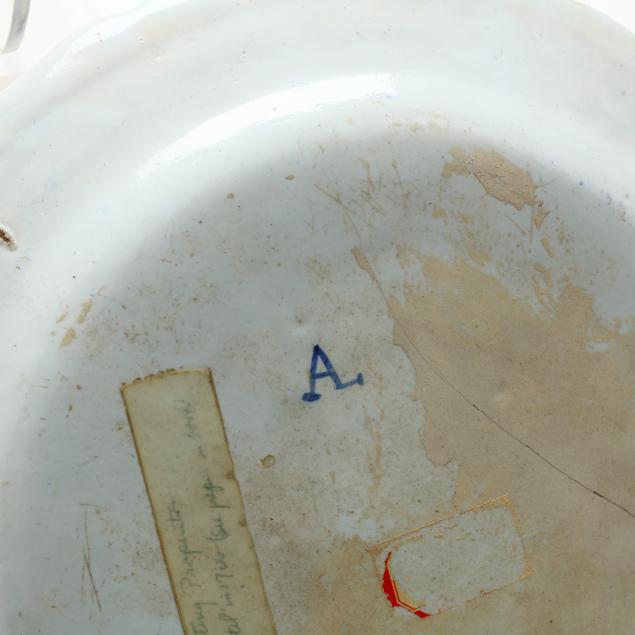 Mid-18th century, the vase has chinoiserie decoration of a mother and child walking beneath an arbor of flowers flanked by prunus and willow tree, marked on the underside LPK (De Lampetkan). The pair of plates with courting couples are circa 1800, marked with a co-joined "AL", unidentified maker (one plate with hairline) (9 3/4 in.), the third plate, late 17th century, marked "BB" unidentified maker (rim fritting).