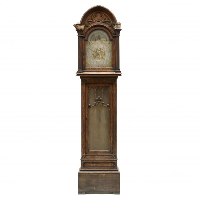 Circa 1900, silverplate and gilt metal face with scrollwork, moon dial, Chime on Fight Bells / Westminster; Chime / Silent; second dial, marked on face "Bawo & Dotter, N.Y., Patentees & Makers" quarter sawn oak case with arched hood Gothic motifs throughout, glass panels to waist door and case sides, with nine tubes, pendulum, three weights, hammer-strike mount.