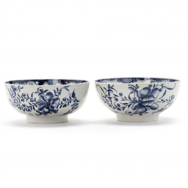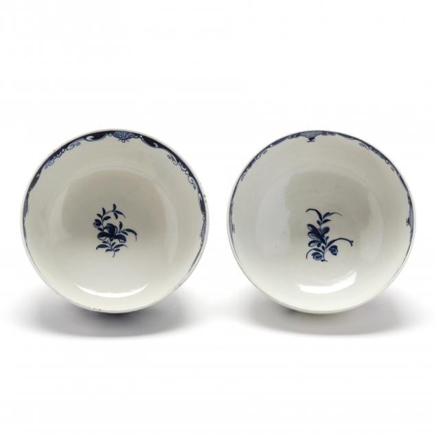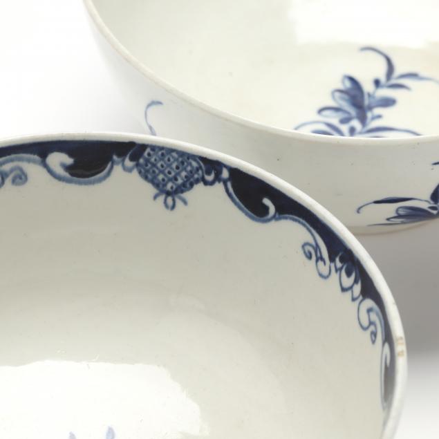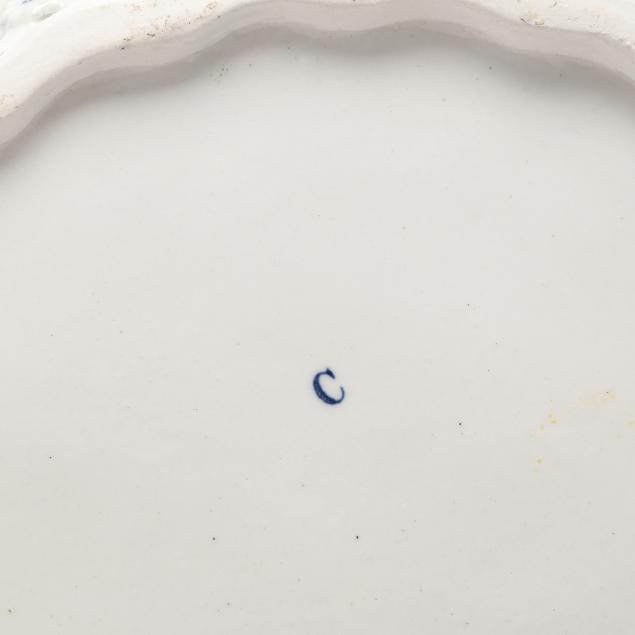 England, circa 1770-90, three (3) oval scalloped and reticulated form baskets with applied handles, flowers and leaves, blue underglaze printed flowers and fruits inside, blue printed crescent mark on bottom (pine cone 11 in. and 8 1/2 in.) (gilliflower 10 1/2 in.); two (2) footed bowls (2 1/2 in.) and (8) pine cone pattern plates (each 9 5/8 in.).