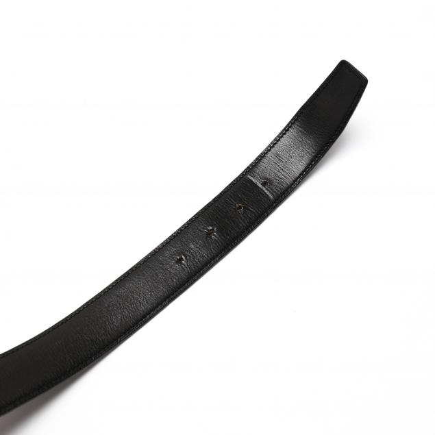 Made in France, probably 85, composed of black pebbled leather and black smooth leather with palladium coated H buckle, marked "Hermes", belt size does not appear to be marked.