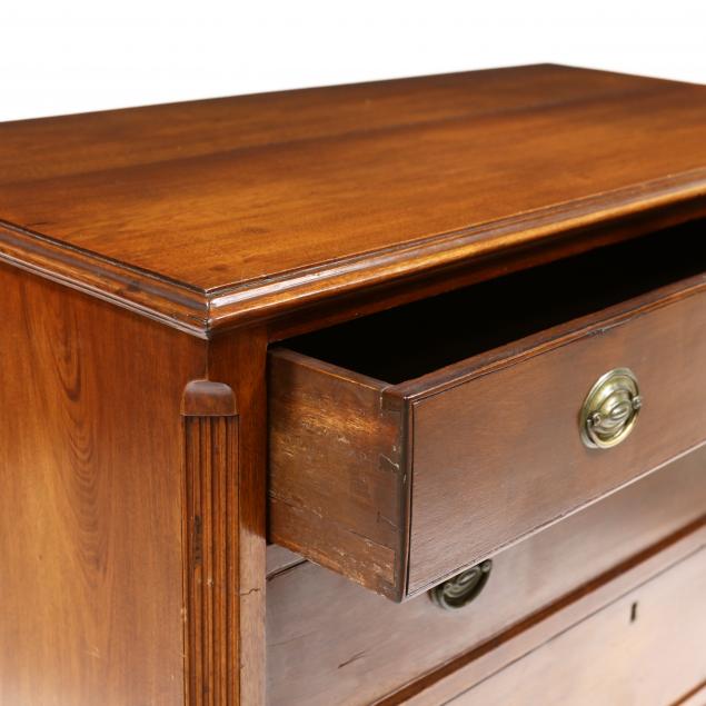 Early 19th century, poplar secondary, two board rectangular top with applied molded edge and chair rail overhang, four graduated drawers with scratch bead, fluted quarter columns with lamb's tongue, distinctive scalloped skirt tapered stylized French foot.