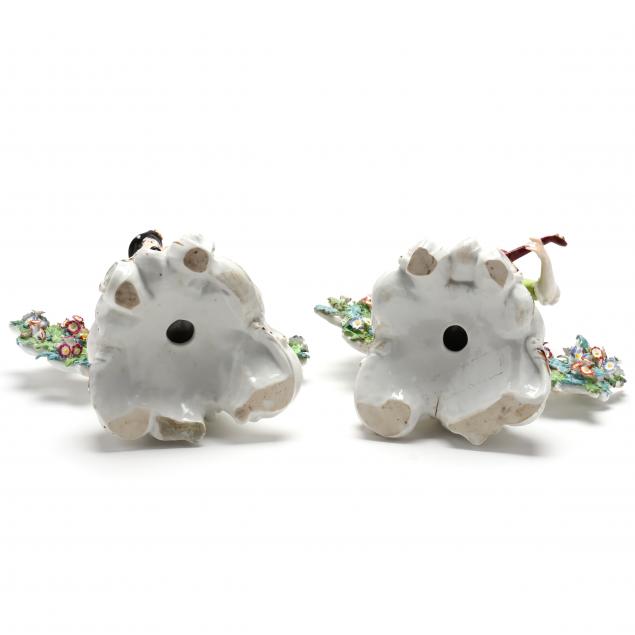 19th century, to include: a Crown Derby figure of a woman fishing, incised model 163, iron red Derby mark (firing crack to base; scraped glaze on the underside; broken leaves) (6 3/4 in.), two large figures of women attired in flowing cloaks holding aloft a floral bud (11 in.) (breaks and loss to fingers and flowers; on one, the Derby mark has chipped off, both with repairs to outstretched arm/hand), two gold anchor Chelsea Rococo figures (damage to bocage; a few firing lines; damage to the base of the male figure). All with factory stamps.
