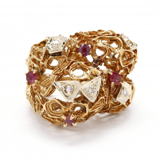Sculptural ring with openwork dome and set with single cut diamond melee and with round cut ruby accents, testing 18KT.