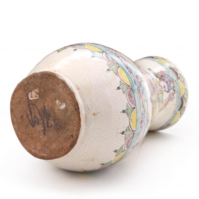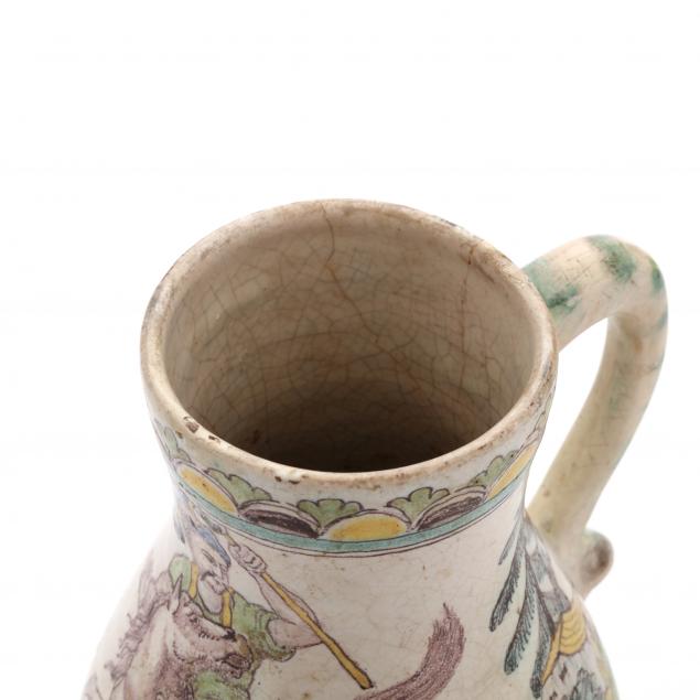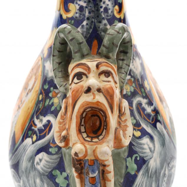 19th-20th century, (2) two Pilgrim Bottles each with satyr or goat handles, a style thought to have originated in Urbino, one lacking cover (taller 15 1/4 in.) (chip to cover, underside tight hairlines), a wine jug depicting Genghis Khan (crazing; rim fill; several hairlines from the rim) (9 in.), not marked.