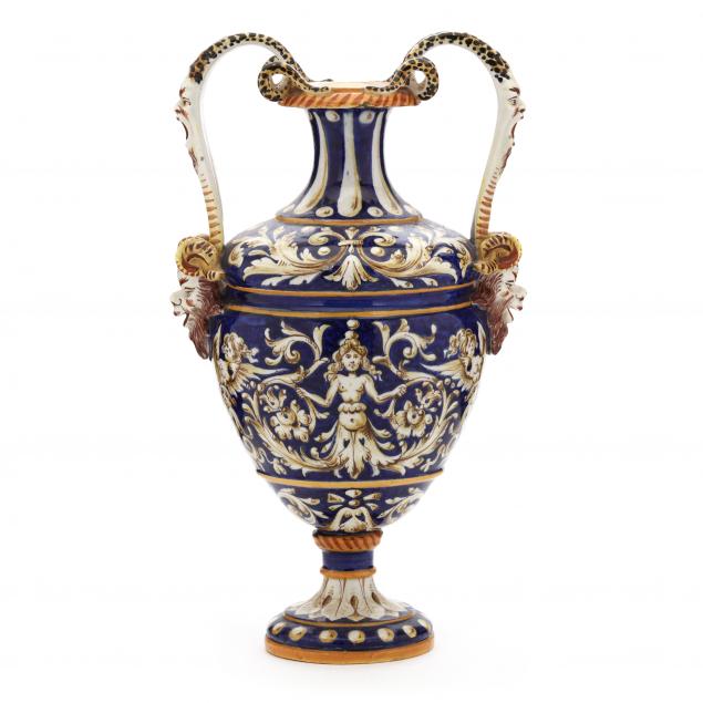 Early 20th century, the first, with blue ground, features scrolled mask handles, the body painted with angelic forms, unidentified mark to the underside (15 1/2 in.) (scattered chips) and a baluster jar and cover, painted with a pastoral scene, labeled in blue on the verso "F.L.V. 1736", probably referring to a pottery factory established near Naples in that year (HOA 15 1/2 in.) (numerous handle chips) not marked on the undersides.