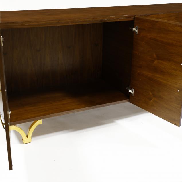 Contemporary, walnut veneer, rectangular case with four hinged doors having long brushed brass pulls, shelved interior, over two flush drawers, shaped gold leaf feet, labeled.